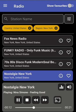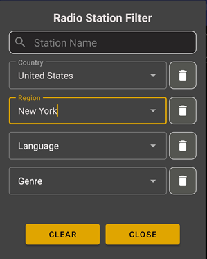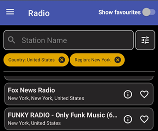 - Station filtering by name, genre, language, and country. Regional filtering is also available for selected countries.