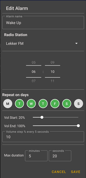 In the Edit Alarm dialog, enter a name, select a radio station from your favourites list, set a time of day, choose active days, set starting and ending volumes, define a volume step, and set the maximum duration for the alarm playback. Tap SAVE to save your alarm.