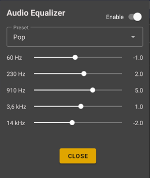 Tap the Enable switch to activate the Equalizer. Select a predefined preset or choose the Custom option and adjust the frequency values as preferred.