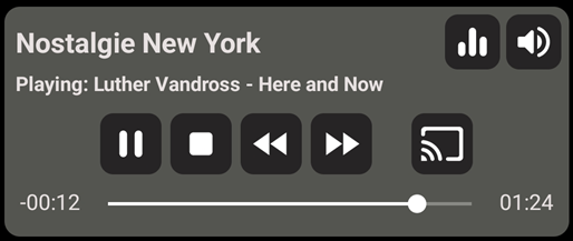 If Enable playback seeking is enabled, the app stores audio in memory according to your configured buffer size. You can seek through any content currently stored in memory. If Enable streaming in Foreground Service is enabled, the app will start a streaming notification. Tap the Stop button on the notification to close it. This will stop streaming, but playback will continue until all buffered audio is finished.
