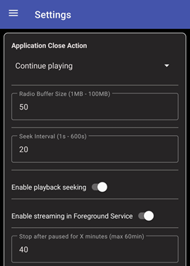 Application Close Action. This setting allows you to choose whether the app should stop playing and close all services when you exit. Select 'Stop Service' to always close services when exiting, even if the radio is playing. Select 'Continue playing' if you want the playback service to continue when the app is closed. The 'Continue playing' option is recommended for low-specification phones, as Android might close the app to free resources while the radio is playing in locked mode.